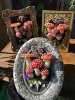 These are a recreation of Amanita muscaria mushrooms! There's a switch to make it glow🤍 Battery operated (CR2032), comes with batteries & 2 light colors for each frame(yellow & red). Can be hung up on wall. Snake & opossum vertebrae ethically sourced. Approx size 8”x6”
