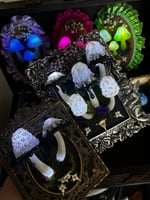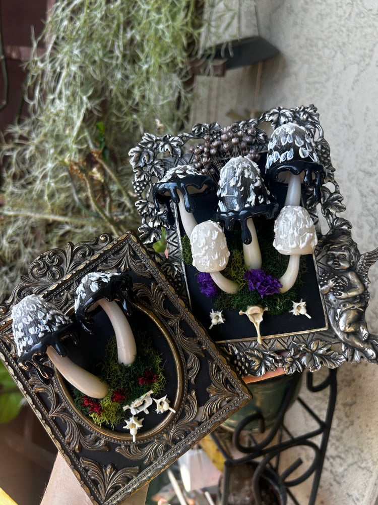 These are a recreation of Inky cap mushrooms! There's a switch to make it glow🤍Battery operated (CR2032), comes with batteries & 2 different colors in each frame. Can be hung up on wall. Snake vertebrae ethically sourced