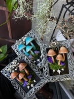 There's a switch to make it glow🤍 Battery operated (CR2032), comes with batteries. Frame size 5”x4” Can be hung up on wall. Snake vertebrae ethically sourced